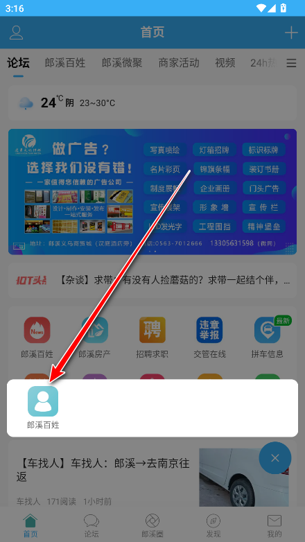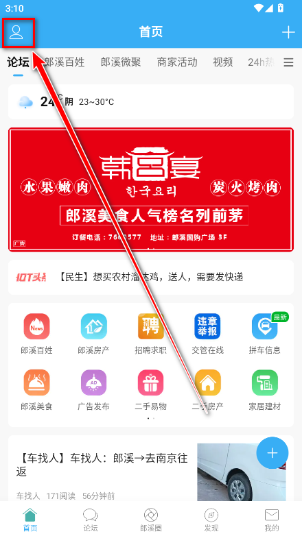 1、首先你需要在本站安装郎溪论坛APP,打开软件后,点击左上角的人像图标。