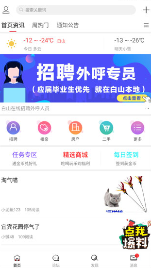 2、接着会看到首页、论坛、发现、消息四个板块,首页里包含资讯、周热门、通知公告等服务,还有招聘、相亲、房产、二手、任务、商城、签到等功能;