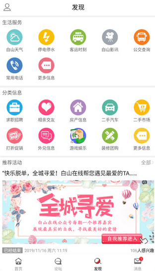 4、在发现板块里,涵盖了白山天气、停水停电通知、客运时刻查询、白山影讯、公交路线查询、常用电话等各类生活服务;同时提供求职招聘、相亲交友、房产租售、二手汽车交易、二手物品市场、商家打折促销、游戏娱乐资讯、店铺外兑信息、装修建材团购等丰富的分类信息;此外还有众多精心推荐的活动。