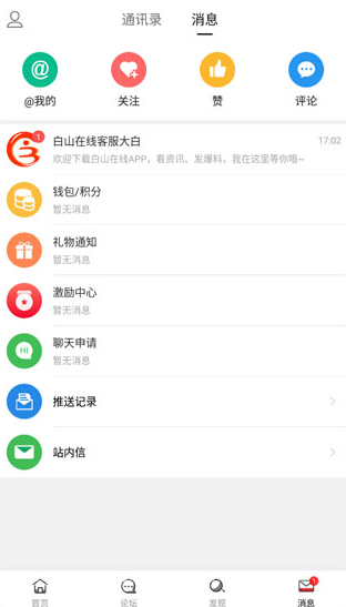 5、消息板块内划分了通讯录与消息两个子模块,其中消息子模块集成了白山在线客服大白、推送记录、站内信、激励中心、聊天申请、礼物通知、钱包/积分等功能入口。