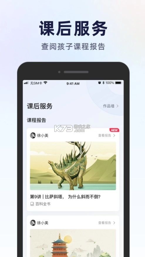 【课后服务】家长和学生可查看兴趣课程报告,拍摄并上传孩子的成果作品,还能在作品墙浏览其他孩子的作品并互相点赞。