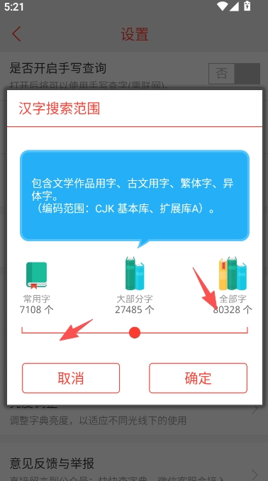 3、向左滑动可缩小搜索范围,向右滑动则扩大搜索范围,可根据学习使用的实际需求进行调整,调整后点击确定按钮完成保存。