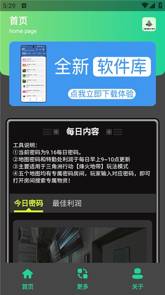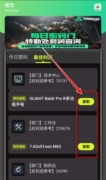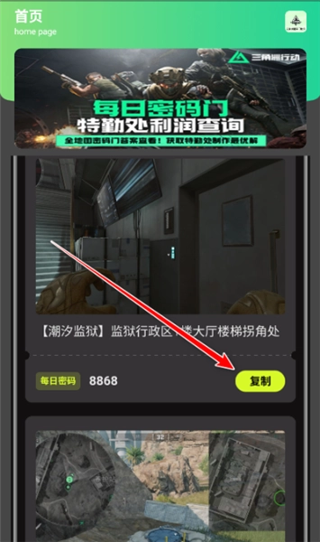 1、启动三角洲密码门助手后,首页会直接展示当天的最新密码信息,点击对应的密码就能一键复制,便于快速使用。