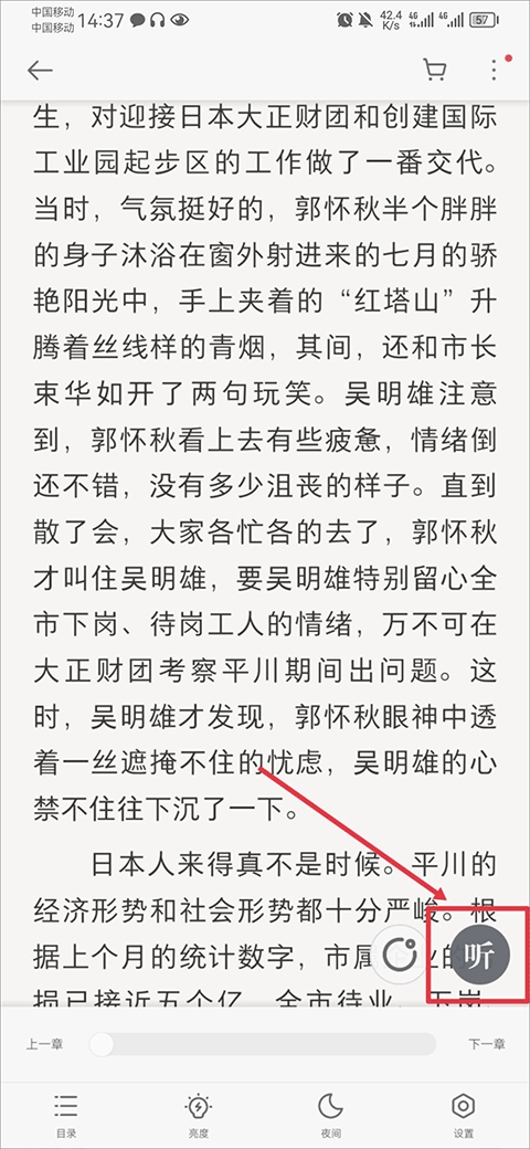 在阅读书籍时,轻点屏幕即可调出功能菜单,接着点击右下角的听字按钮。