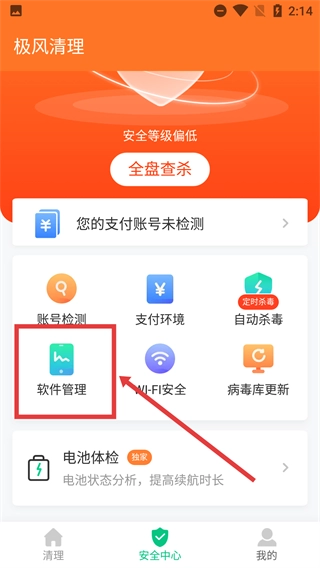 进入【安全中心】界面后,会看到显示【安全等级偏低】的提示以及各类功能选项,接着点击【软件管理】这一选项,就能进入到软件相关的管理页面。