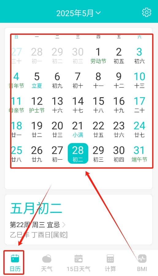 安装云彩日历的最新版本,打开应用进入主界面后,就能查看日期相关信息了。