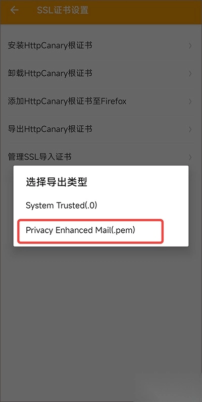 4、 导出类型选择下面这个(.pem)【我这里是未root环境,选择.pem。如果root之后需要更高要求可选.0】