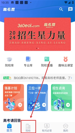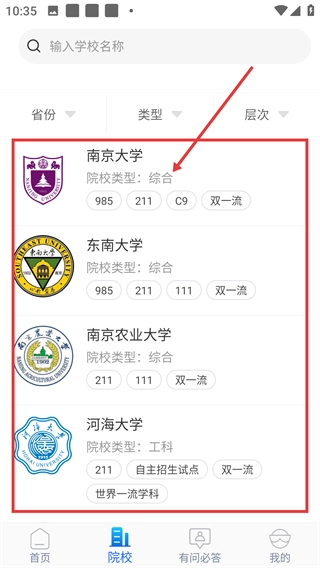 1、在首页点击底部的【院校】选项,就能进入院校列表页面,查看各类高校的相关信息。