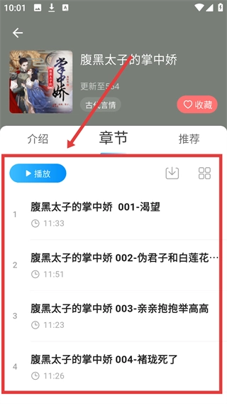 3、进入书籍详情页后,点击【章节】选项卡,就能切换至章节列表界面,以便选择具体章节进行收听。
