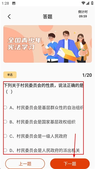 进入答题页面后,选择对应题目的答案,点击“下一题”按钮继续作答,直到完成所有题目为止。