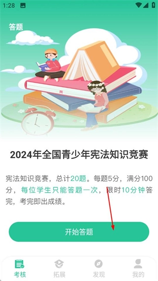 1、在考核页面找到2024年全国青少年宪法知识竞赛的入口,点击“开始答题”按钮。