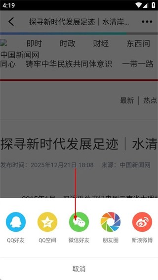 3、在分享菜单里选择相应的分享渠道,就能完成新闻分享的操作。