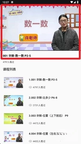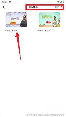 点击课程辅导后,选择对应的年级与科目,像小学一年级数学这类,就能查看相关的教学视频了。