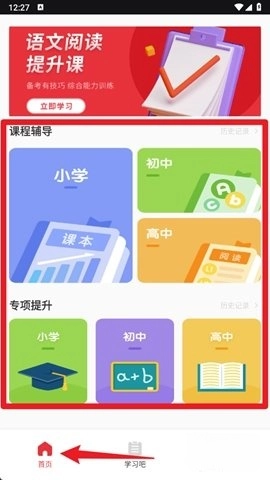 在首页界面,您能看到课程辅导与专项提升这两个模块,它们包含了小学、初中以及高中各阶段的学习资源。