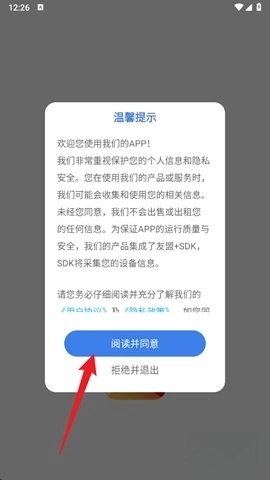首次打开应用,会出现温馨提示界面,请认真阅读用户协议和隐私政策,点击“阅读并同意”按钮就能继续使用应用了。