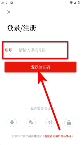 3、进入登录注册界面后,填写手机号码,接着点击发送验证码的按钮。