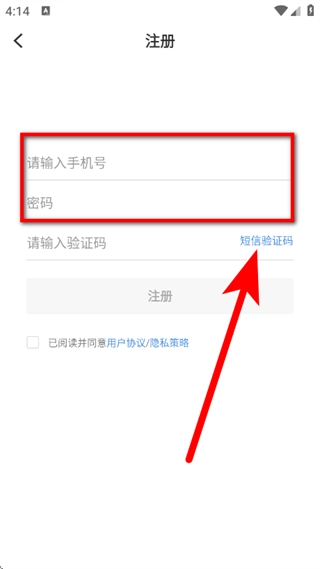 4、进入注册页面后,填写手机号并设置密码,接着点击“获取验证码”按钮。