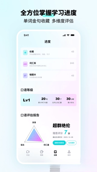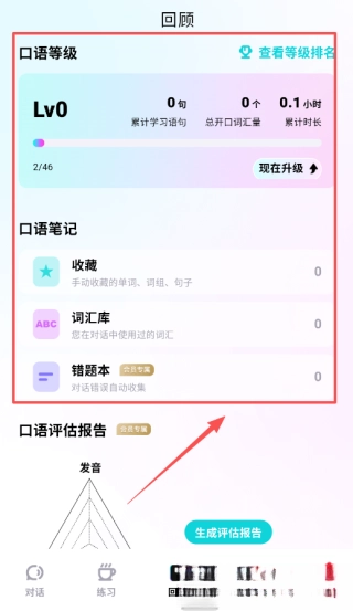 3.完善的回顾体系让用户的学习进展一目了然,既能实时了解自身的口语等级评估与累计学习时间,还能借助等级排行榜和其他学习者一较高下,这种可视化的成长路径与良性竞争环境,会不断点燃你的学习干劲与坚持的热忱。