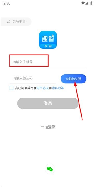 2、在登录页面输入手机号,勾选对应的协议条款后,点击“获取验证码”按钮。