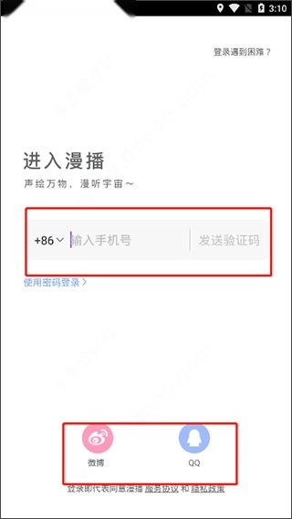 1、首先进行账号登录,支持使用手机号、微博、QQ三种登录方式;