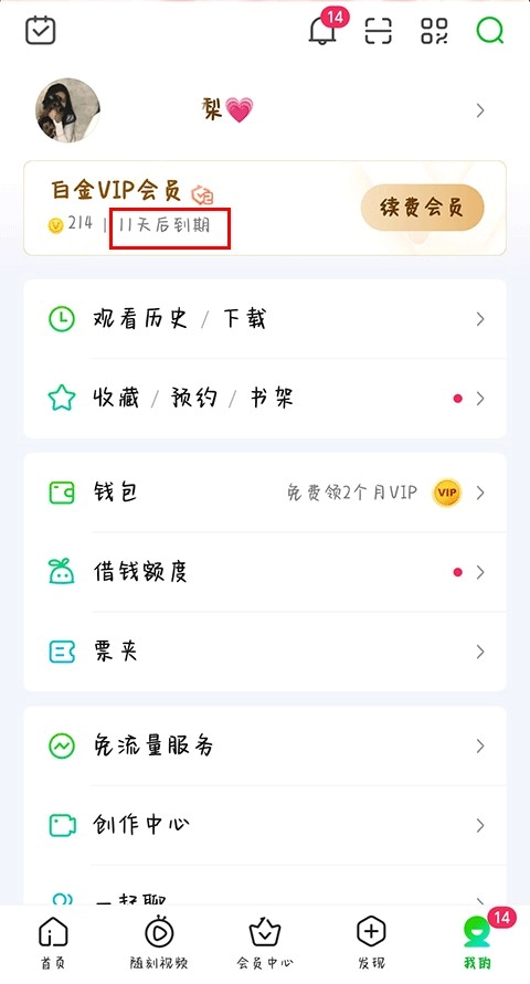 1、进入“我的”页面后,点击页面上方会员栏中的“到期时间”选项;
