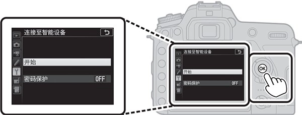 1、进入设定菜单后,选择“连接至智能设备”选项,接着将“开始”选项加亮显示,最后按下ok键。