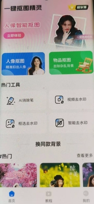 1、在首页中提供人像抠图、物品抠图、各种热门工具,还有热门换同款背景的功能;