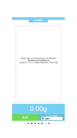 2、打开软件后,将手机放置在平整的桌面上。若手机屏幕上显示有数值,需先点击“去皮”按钮,再进行称重操作,以此确保称量结果的准确性。
