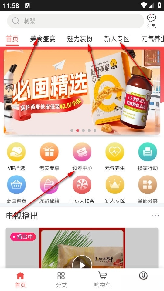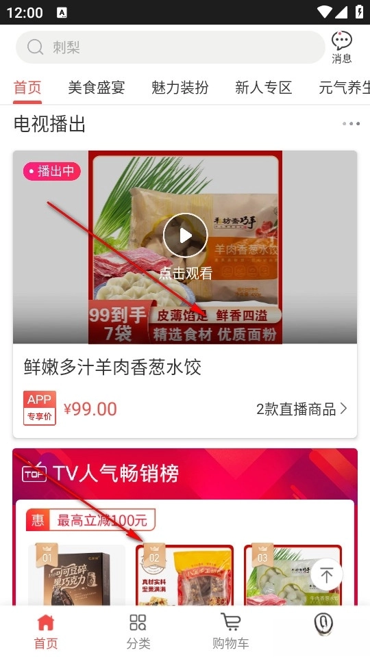 我们可以在首页的这些位置看到当前电视轮播的广告商品,用户能在该软件里直接购买这些轮播广告商品,软件内还会列出电视轮播的热销商品。