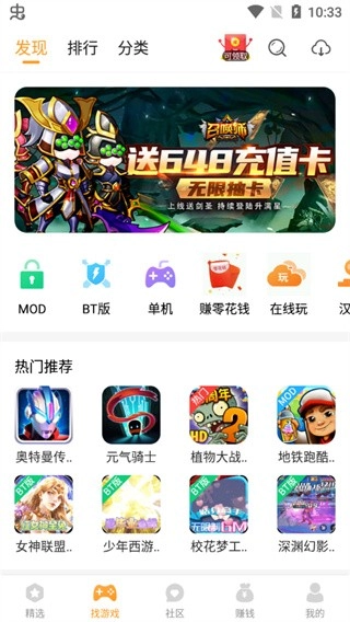 在“找游戏”页面里,包含了MOD、BT版、在线玩、单机、网游以及平台推荐的各类优质游戏。