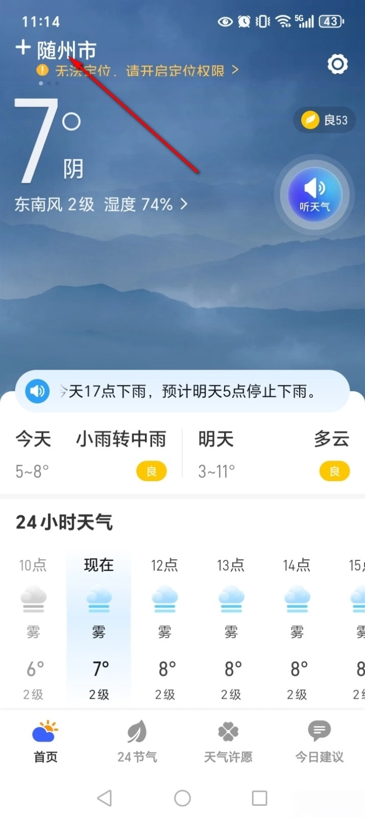 《卫星5G天气报》是长沙意趣软件科技有限公司推出的一款手机天气预报软件,朋友们可以在软件中查看15天的天气预报详情,还可以查看24小时逐小时的天气,让你能够提前做好准备,软件中还有着24节气知识可以了解学习,可以参考推荐的各种生活建议。