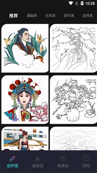 2、在“创作馆”页面向下滑动,大家就能挑选自己喜欢的绘画作品来进行上色创作啦;