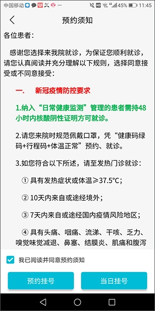2、阅读预约须知后,结合自身时间情况来选择进行当日挂号或者预约挂号