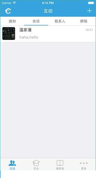2、登录成功后,进入互动页面,就能看到你与朋友的会话界面,在这里你既可以和联系人进行互动,也能创建或加入群组。