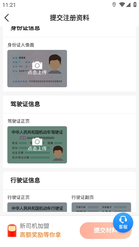 2、用户满足招募条件后,只需要提交身份证正反面照片、驾驶证正反面照片、行驶证正反面照片,同时规定照片不能ps、不能模糊、不能有涂改痕迹且边框要拍全,避免识别不出,同时证件照信息与用户填写信息必须保持一致。