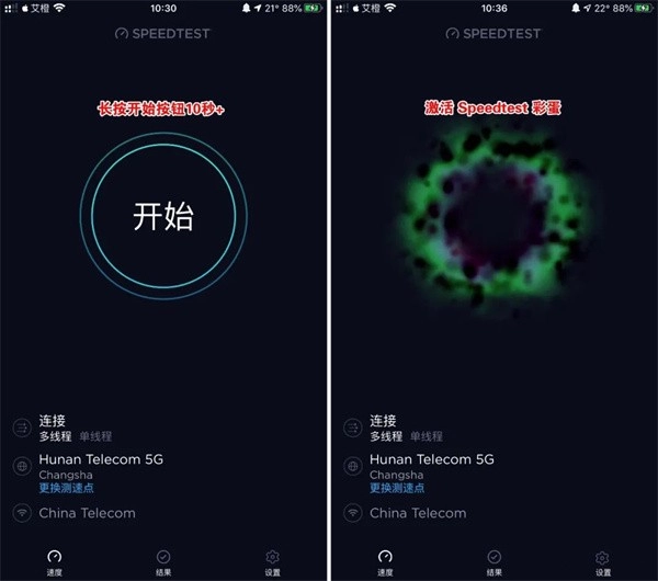 激活彩蛋:在 Speedtest 主页面长按开始按钮,十几秒后就会激活彩蛋。