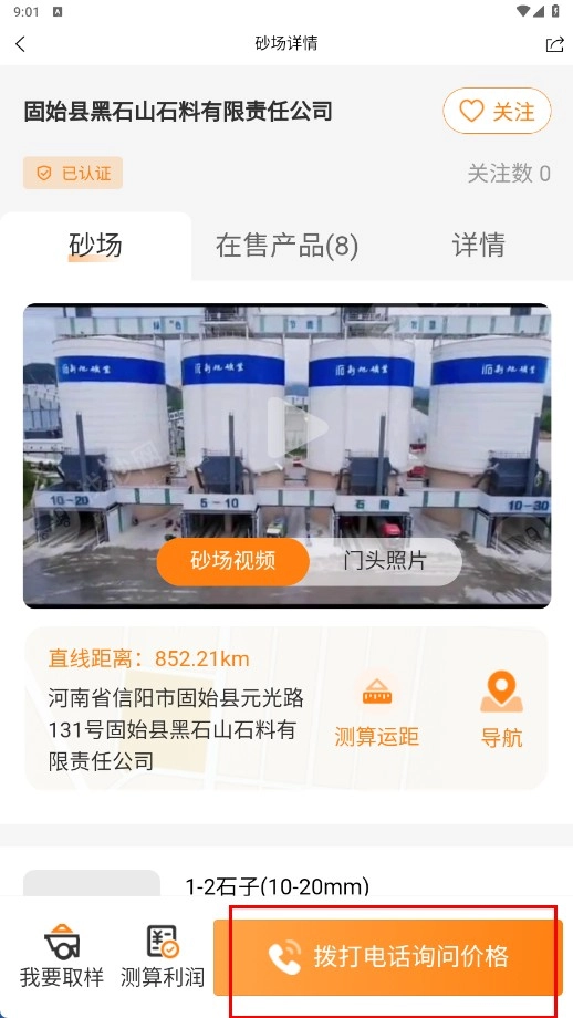 进入砂场详情页面后,可点击【拨打电话询问价格】功能按钮,咨询砂场产品的价格。
