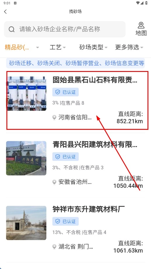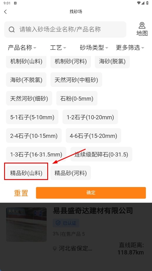 在查找砂场的页面中,选择【精品砂(山料)-产品类型】这一选项来开展筛选操作。