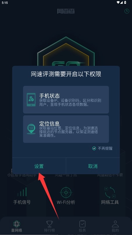 4、根据系统提示开启手机状态和定位权限设置,完成后将自动进行网速评测分析。