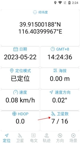 2、软件首页会开启定位功能,您可在右下角查看系统检索到的卫星以及参与定位的卫星信息。
