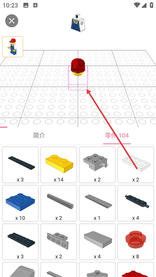 在虚拟拼搭界面中,你可以挑选零件(例如红色零件),并把它们放置到相应的位置上,以此来完成拼搭的各个步骤。