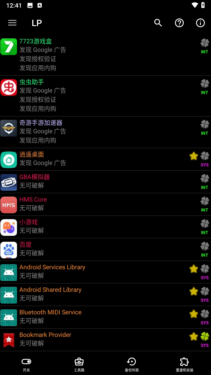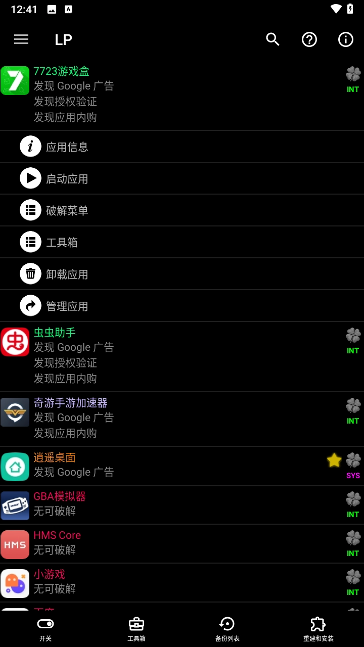 23、支持按多种条件筛选应用列表,包括授权验证、Google广告、自定义、虚拟机缓存修复、未发现、已修改。