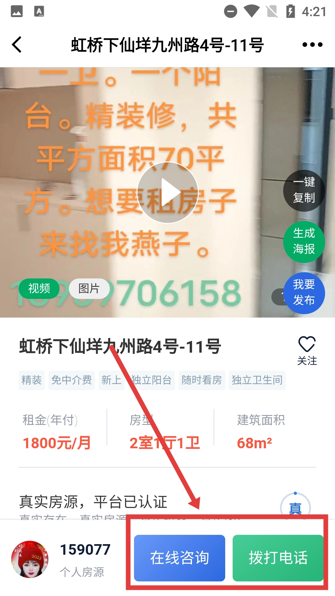 在房源详情页点击【在线咨询】或【拨打电话】按钮,就能联系房东,咨询租房的相关问题。
