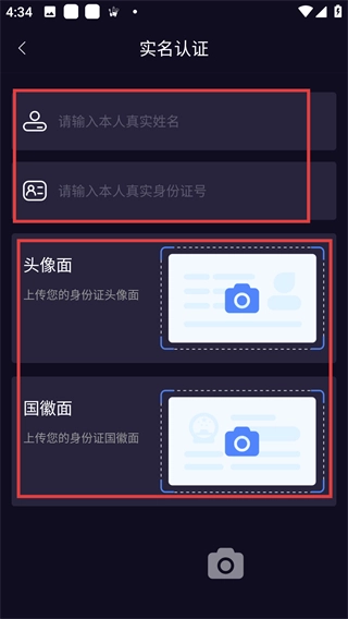 在实名认证页面填写真实姓名与身份证号码,上传身份证的头像面及国徽面,即可完成实名认证流程。