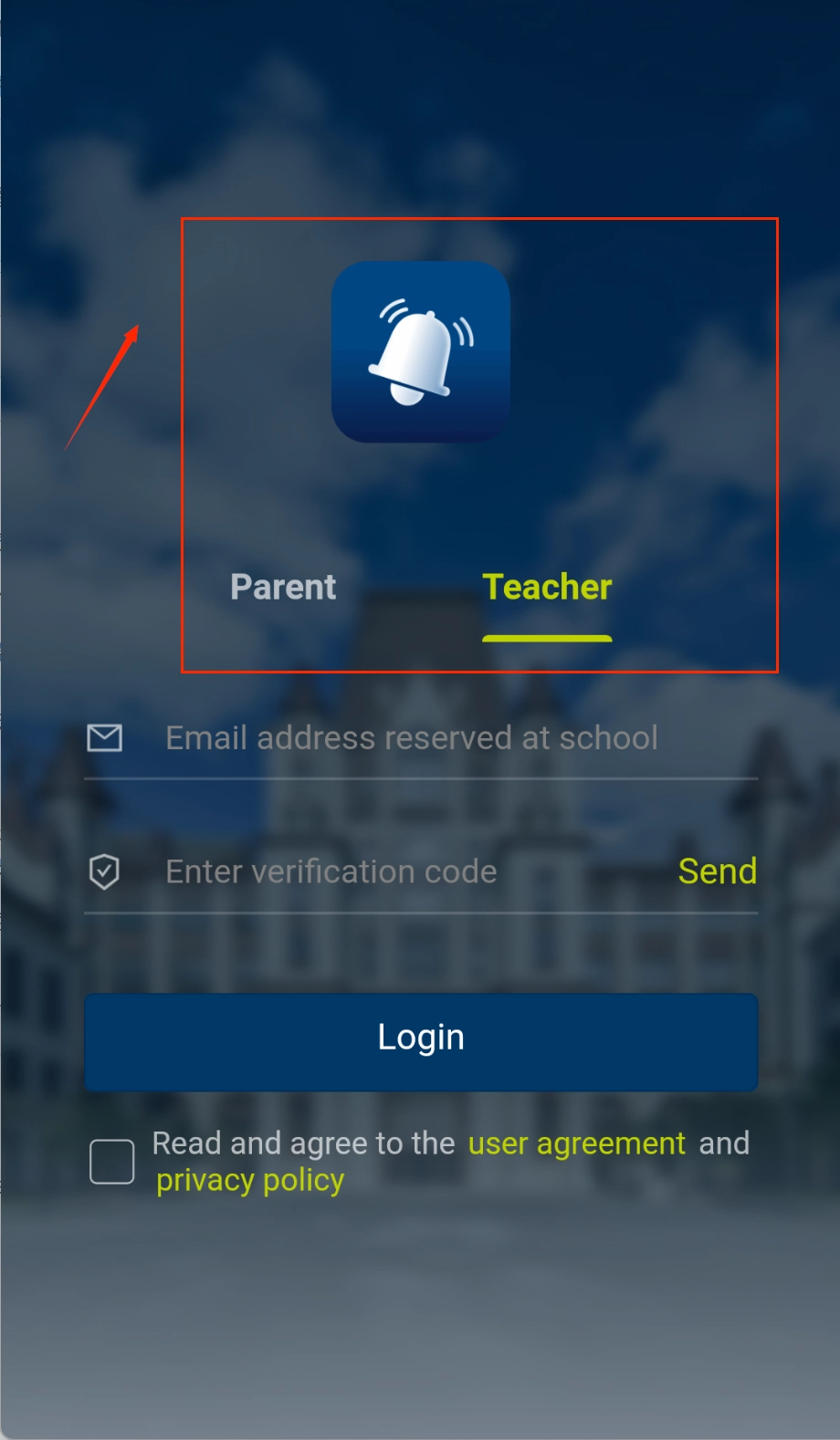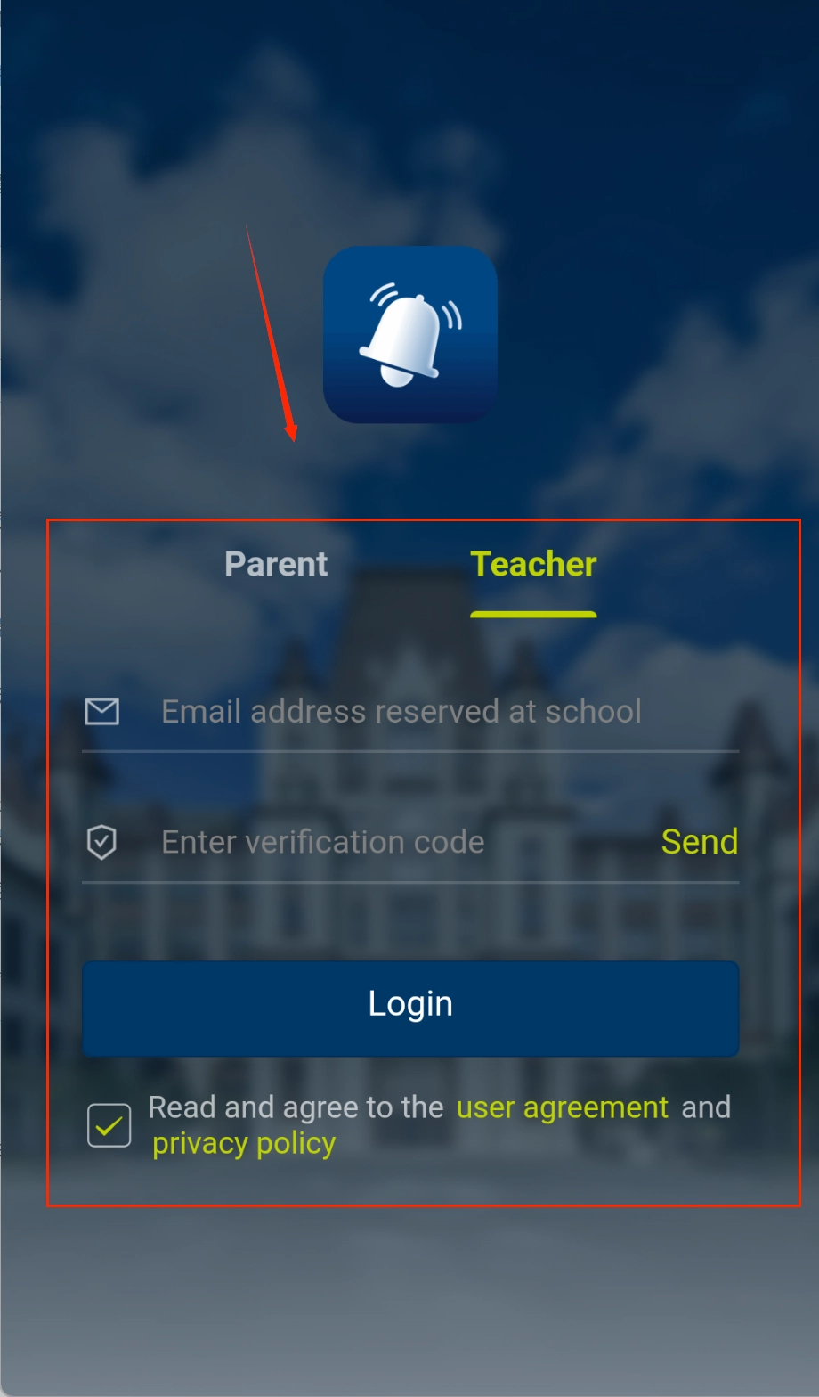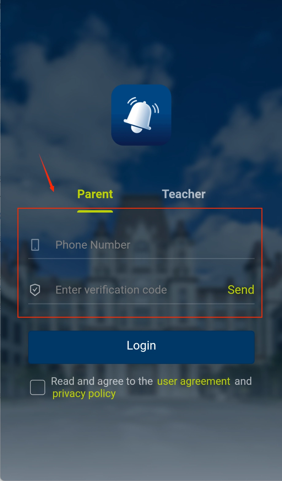 是专为家校沟通设计的移动平台,实时推送学校通知、作业布置与成绩单,支持在线请假与家长会预约,提供学生考勤、课表查询等功能,教师端可发布班级动态与学习评价,家长端随时查看孩子在校表现,构建高效透明的家校共育环境。打开软件后,首先映入眼帘的是登录界面,界面最上方清晰显示着当前时间,中间位置有一个十分醒目的蓝色铃铛图标,下方则设有Parent和Teacher两个身份选项供用户选择。
