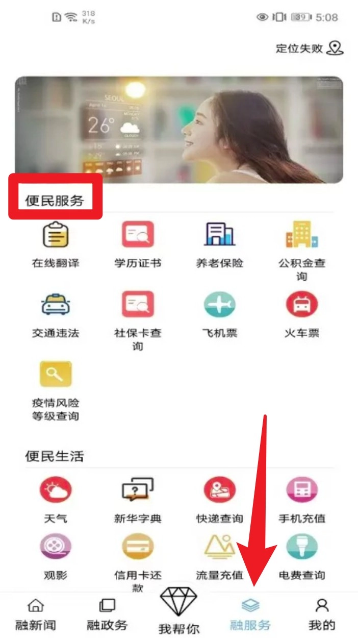 回到首页后点击底部的「融服务」选项,就能进入便民服务板块。这里提供社保查询、公积金查询、交通违章查询、疫情等级查询等实用功能,所有服务都能一键直达,无需繁琐操作。