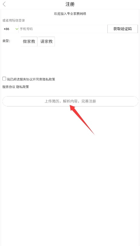 填写手机号码获取验证码,选定用户类型并上传个人简历,勾选相关协议后即可完成注册流程。