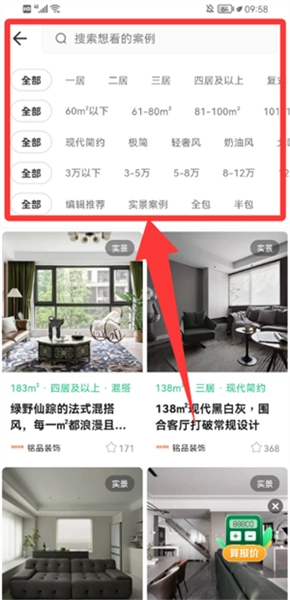 通过户型面积等条件筛选,定位符合需求的装修案例。