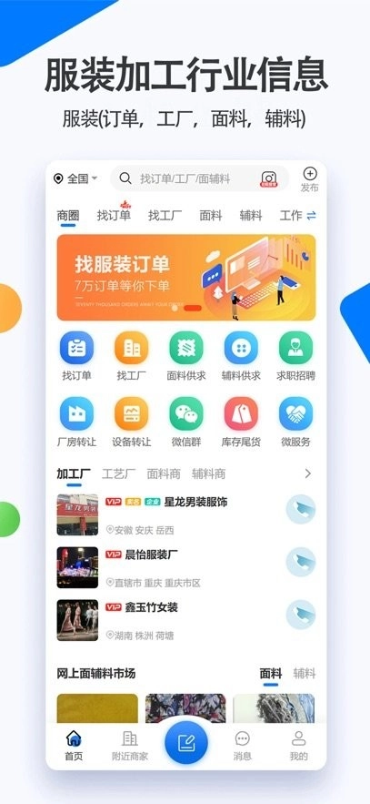【服装圈】服装加工订单、面料辅料供求信息平台!作为服装行业的领先信息平台,我们致力于为服装从业者提供一站式、高效、便捷的服务体验。深度融合服装产业链上下游,凭借强大的资源整合能力,助力服装企业实现快速成长与转型升级。