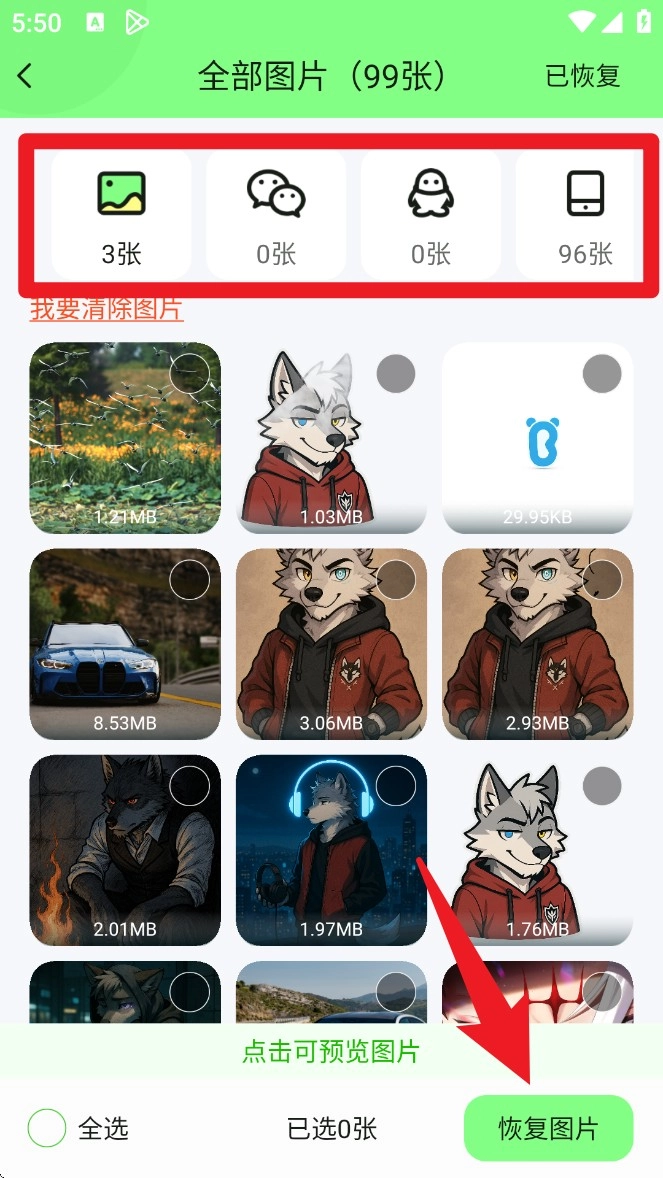 扫描完成后,系统会把不同来源的图片分类展示出来。你可以点选任意一张图片进行预览,选中想要恢复的图片后,点击下方的「恢复图片」按钮,就能将这些图片找回了。